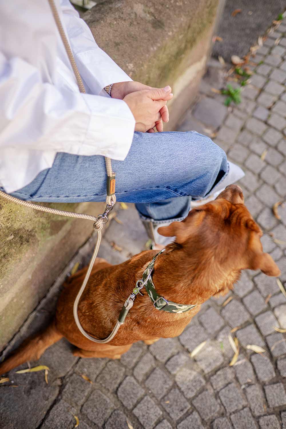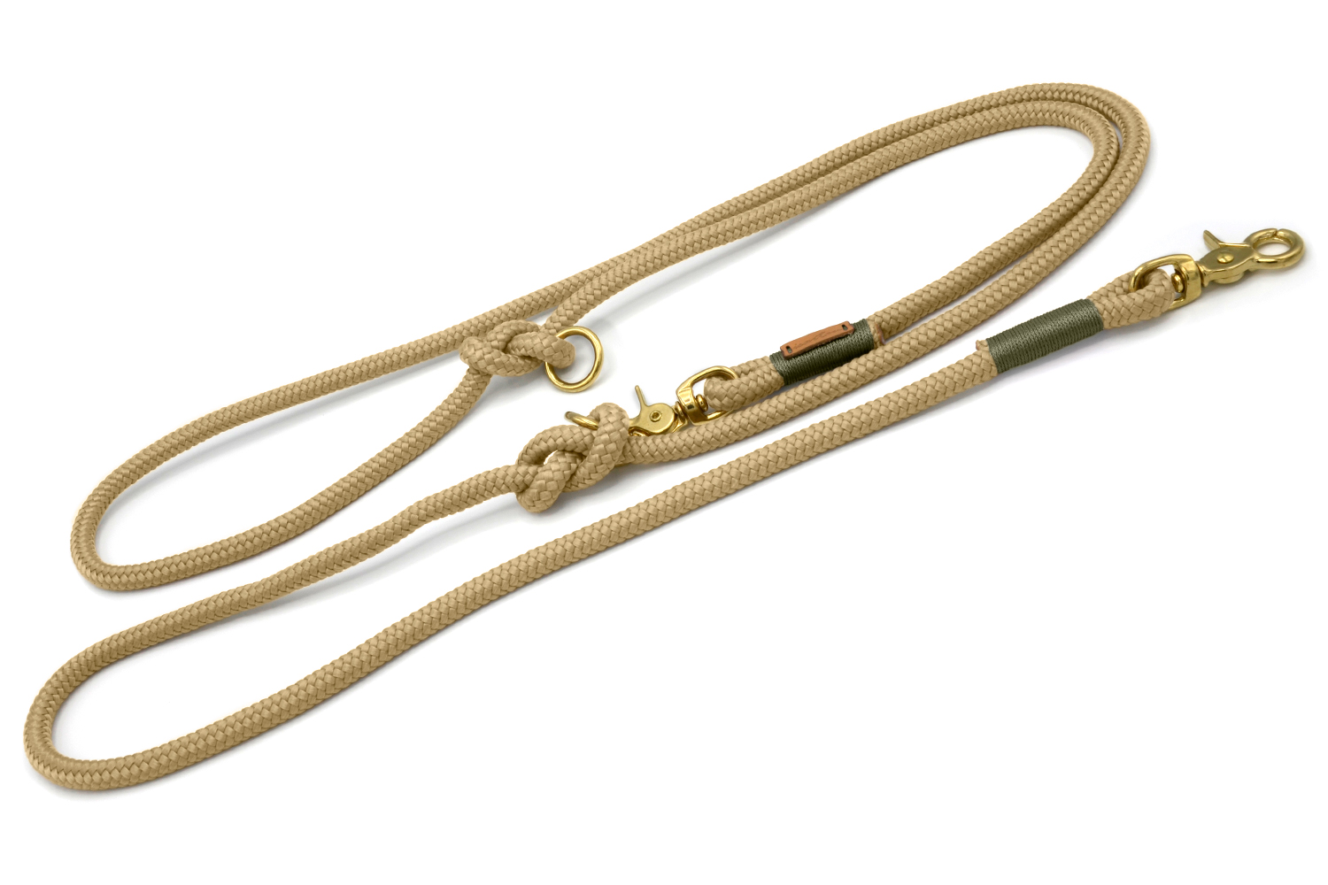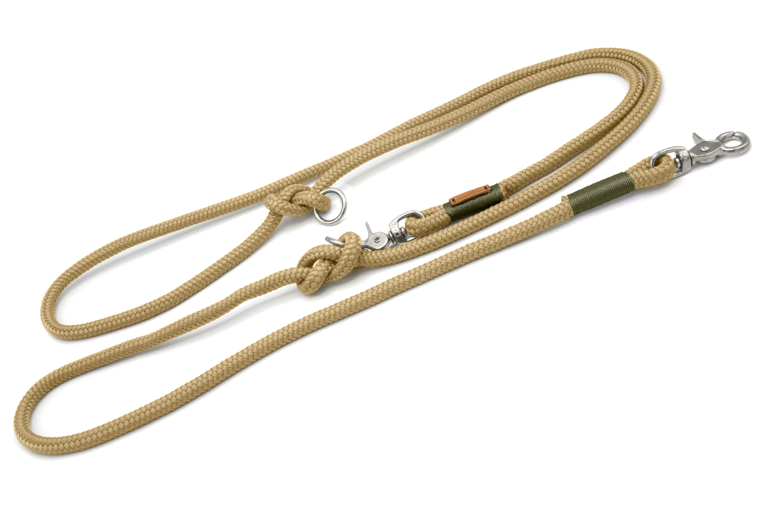 Die Retrieverleine kombiniert Halsung und Leine. Die Halsung ersetzt das Halsband und passt sich dem Hundehals durch zwei jederzeit individuell verschiebbare Knoten an: