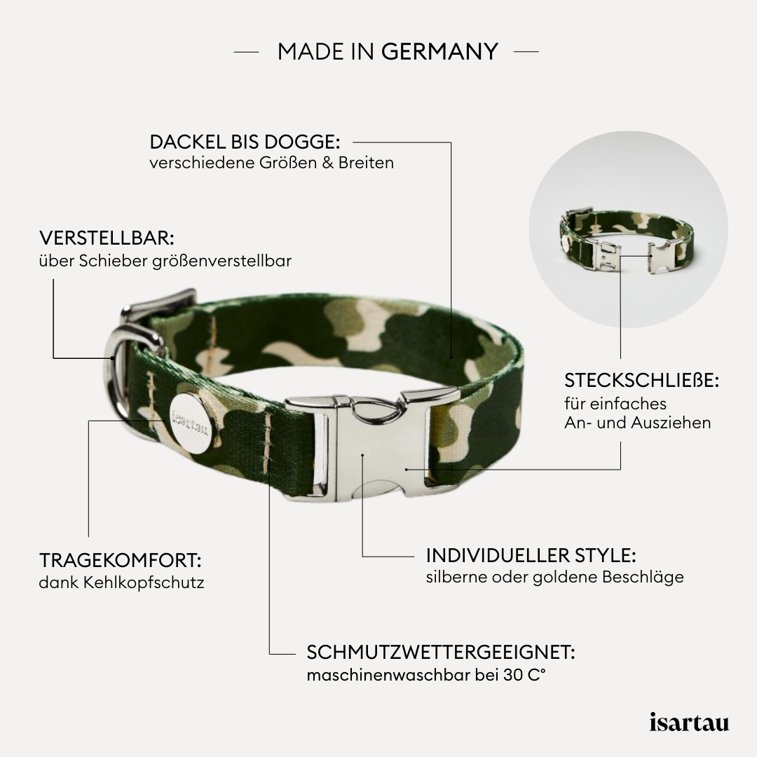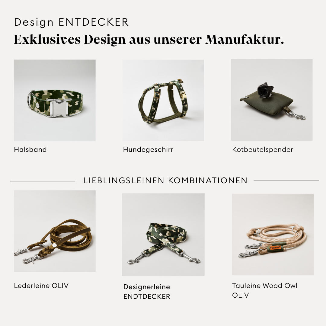 Dein Hund liebt es, die Welt zu erkunden? Dann passt das Designerhalsband Entdecker wie angegossen! Im coolen Tarnmuster bringt es Outdoor-Flair an Eure Seite – und mit der passenden Designerleine wird das Abenteuerlook komplett.