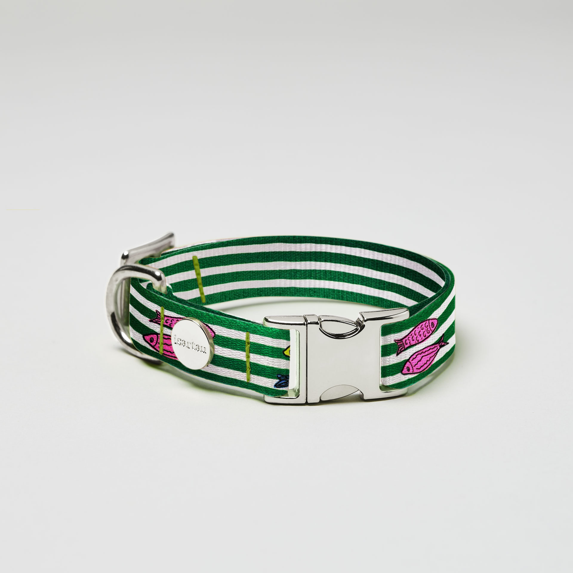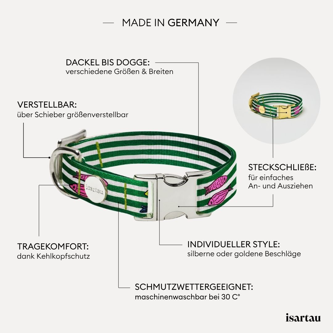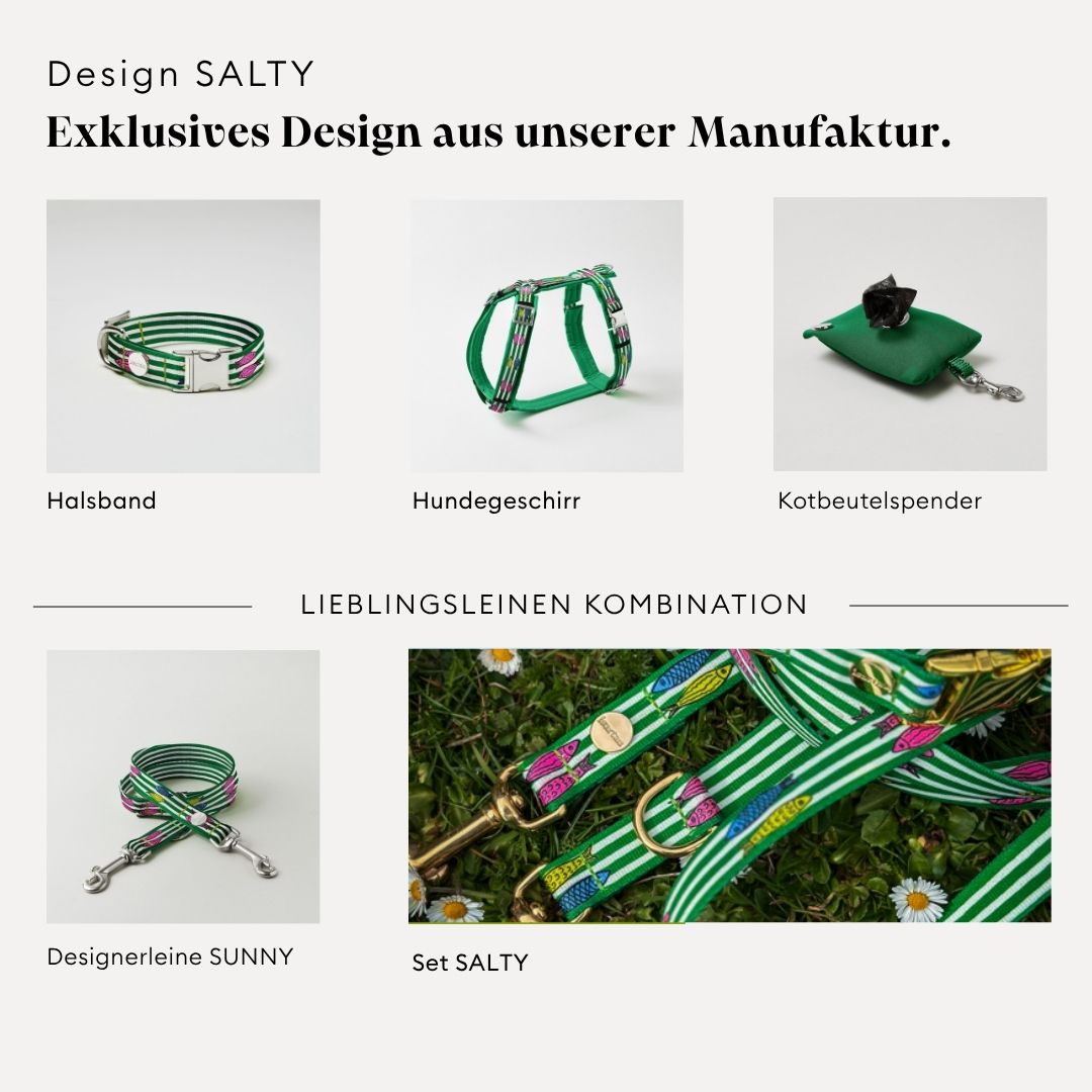 Das „Salty“ Design bringt die Frische des Meeres nach Hause. Streifen in Weiß und Grün treffen auf fröhliche Fischmotive und machen das Halsband zu einem maritimen Statement.