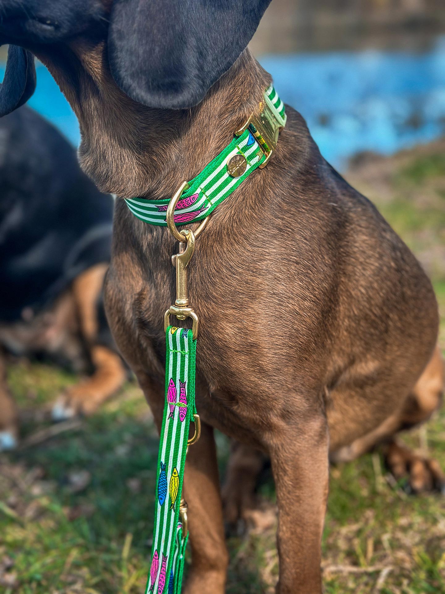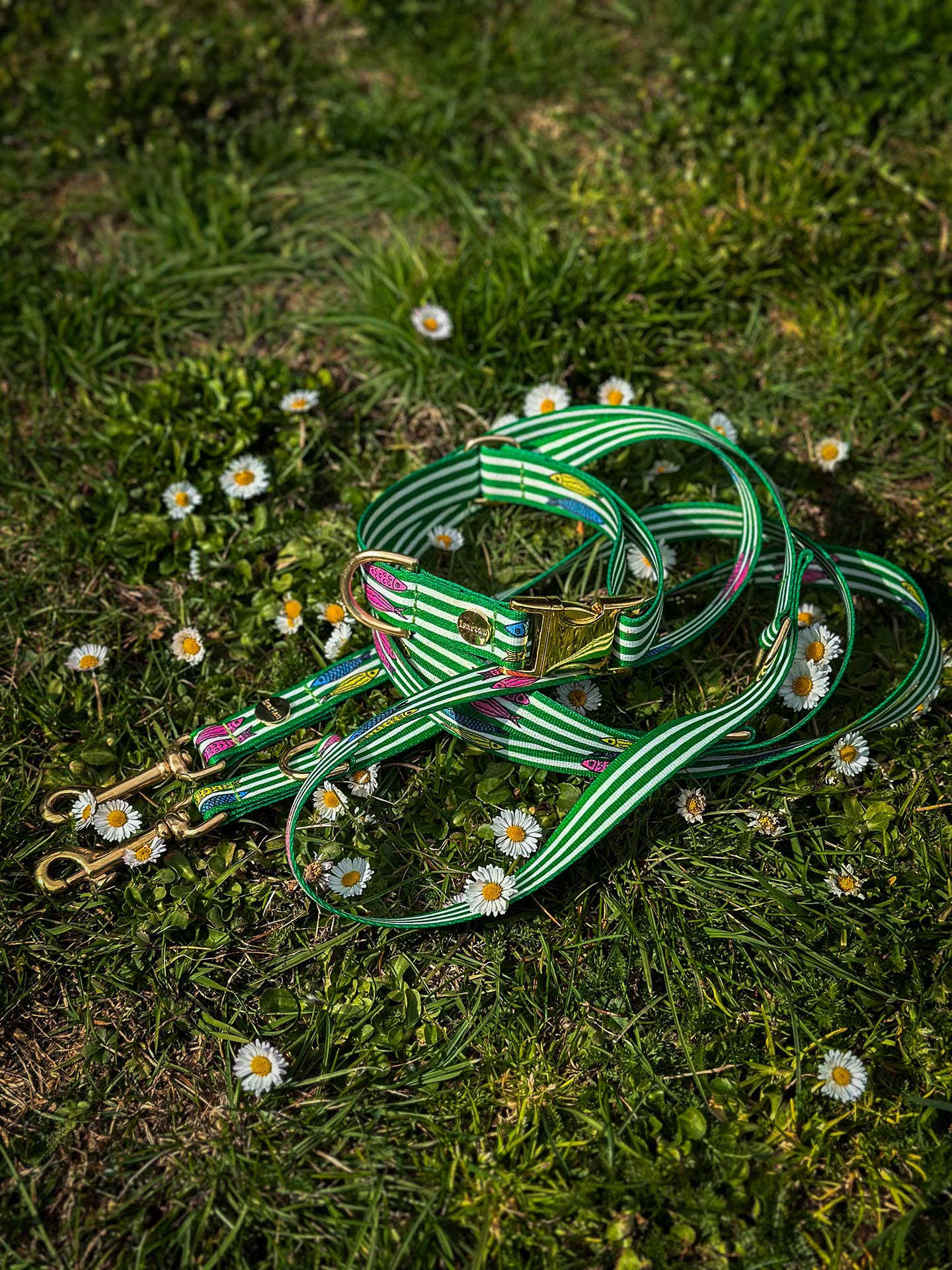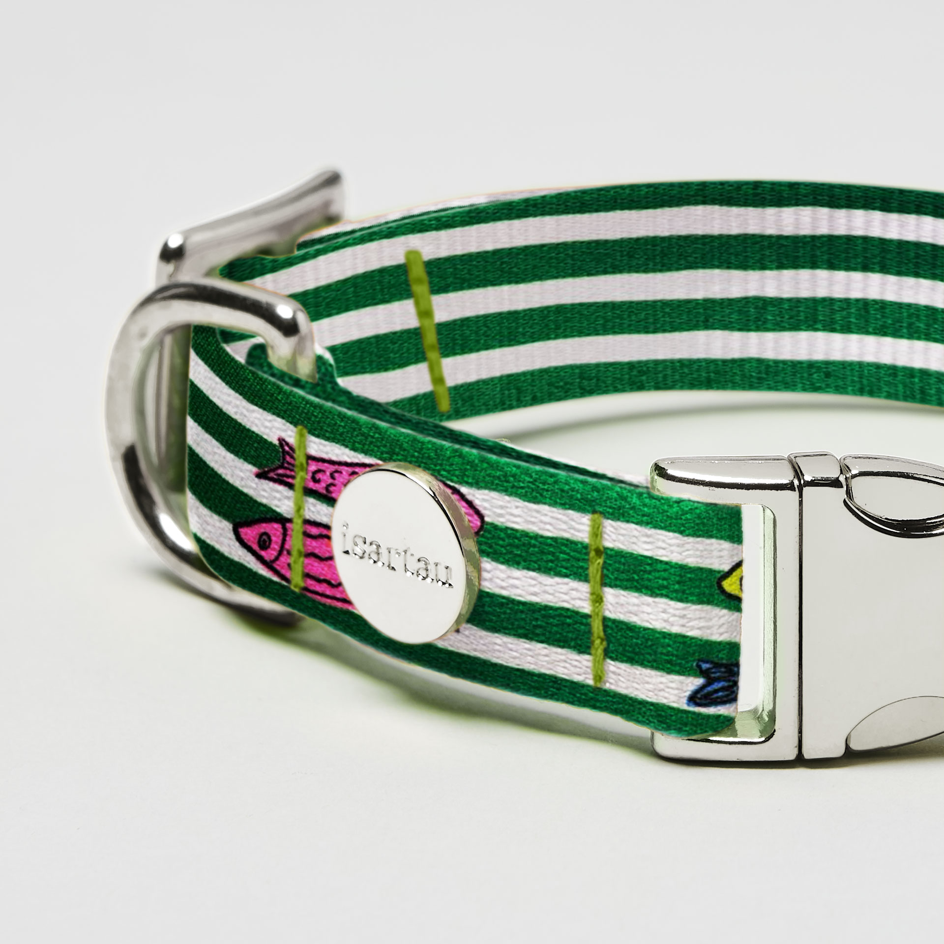 Das „Salty“ Design bringt die Frische des Meeres nach Hause. Streifen in Weiß und Grün treffen auf fröhliche Fischmotive und machen das Halsband zu einem maritimen Statement.