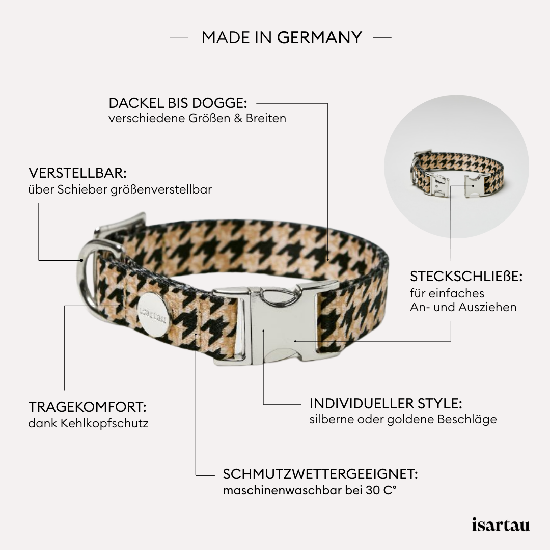 Für einen stillvollen Auftritt sorgt Ihr in unserem Designerhalsband Stadtgeflüster mit klassischem Hahnentrittmuster. Ein Musterklassiker für einen zeitlosen Look. Besonders edel macht es dabei die gewählte Farbkombination in Beige und Schwarz.