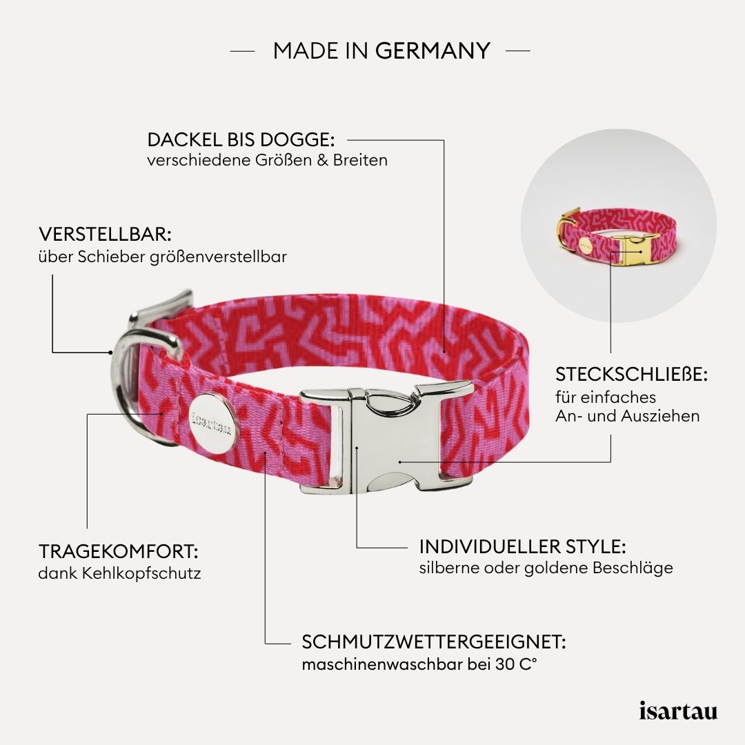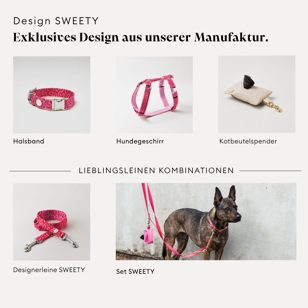 „Sweety“ bringt Farbe in Euren Alltag. Pink und Rot treffen auf ein lebendiges, verspieltes Muster – inspiriert von Eis, Sommer und guter Laune. Ein Halsband, das auffällt und gute Laune macht.