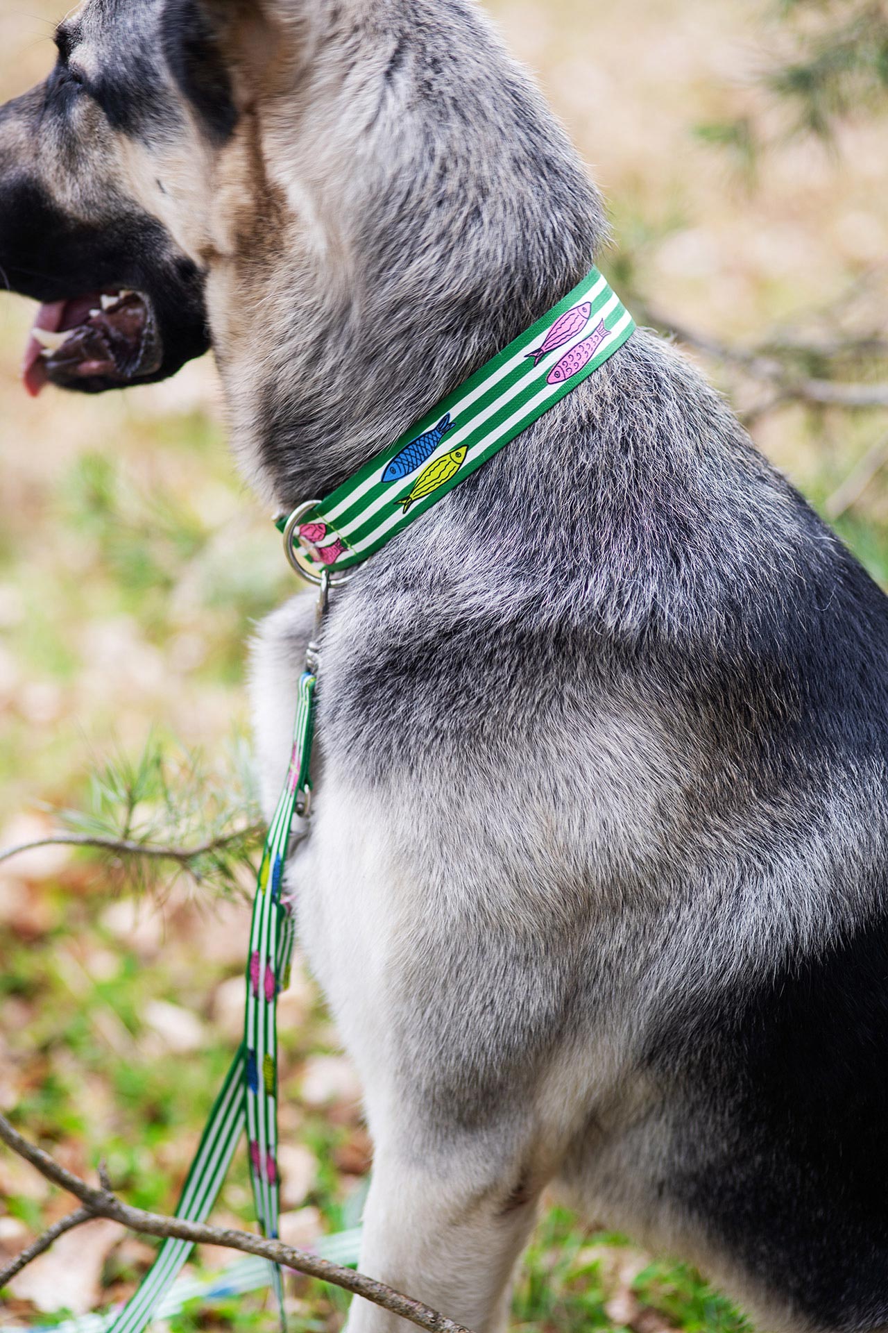 „Salty“ verbindet Weiß-grüne Streifen mit fröhlichen Fischmotiven – inspiriert von maritimen Momenten. Eine Hundeleine, die sich fühlt wie ein Spaziergang am am Meer.