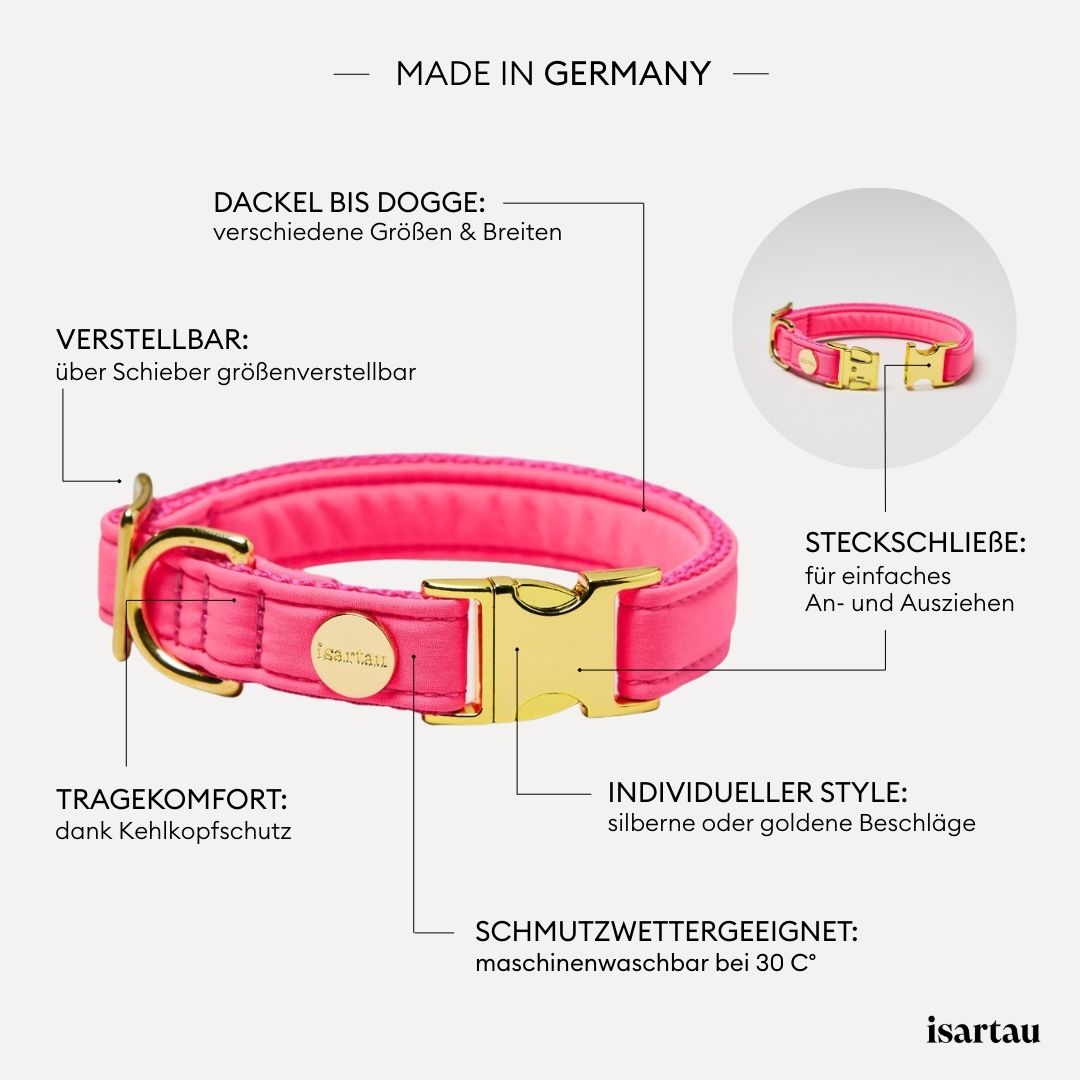 Unser verstellbares Softshell-Halsband in strahlendem Neonpink bringt Farbe an den Hals. Für Mini bis Maxi, gefertigt in unserer bayerischen Manufaktur – für Hunde, die auffallen wollen.