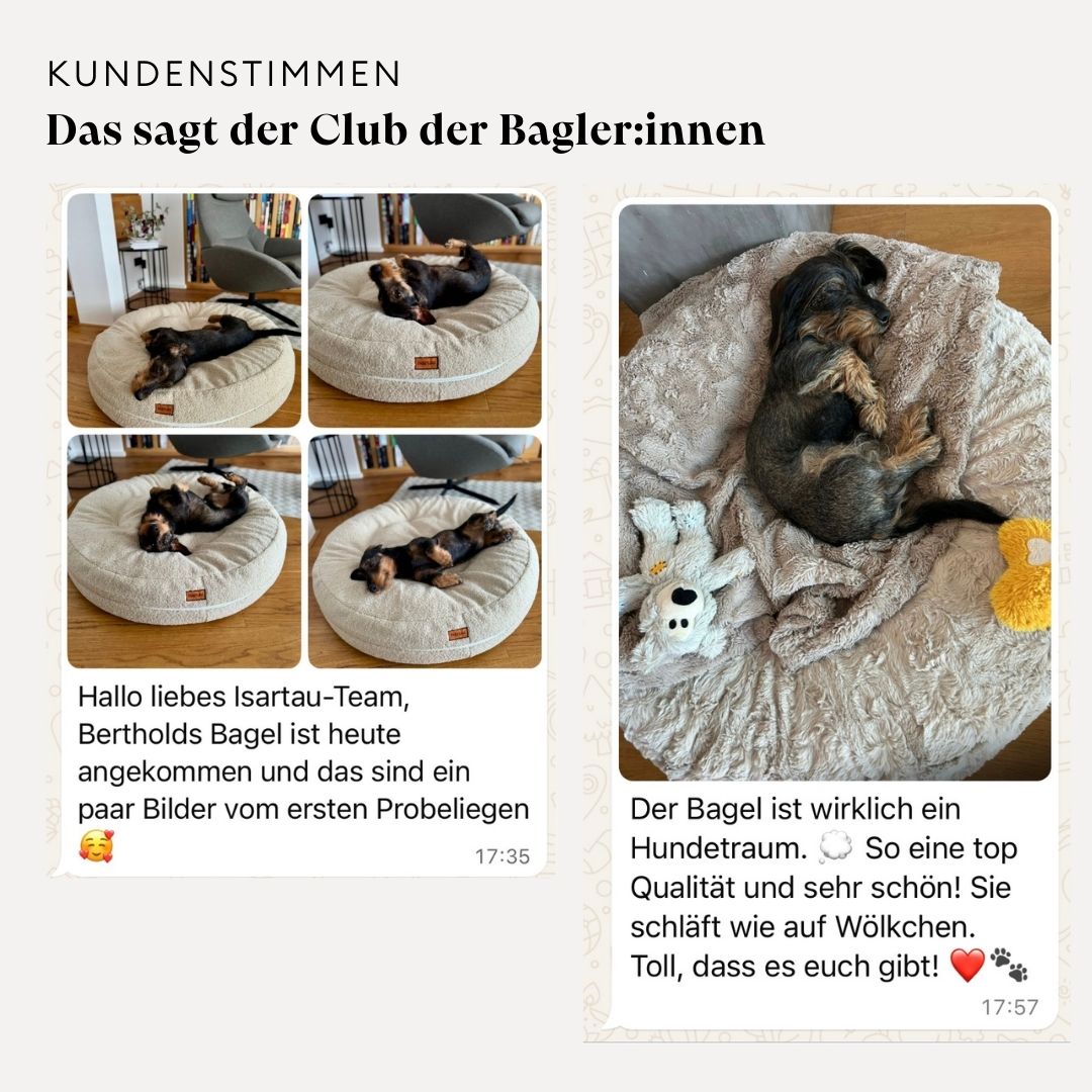 „Ein durchdachtes Hygienekonzept, orthopädischer Aufbau, sichere Materialien – das Bagelbettchen erfüllt höchste Anforderungen an Sauberkeit, Komfort und Funktion. Gerade bei inkontinenten oder allergischen Hunden ein echter Gewinn.“