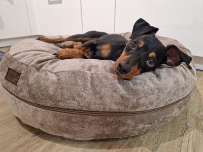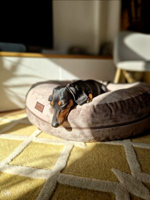 Schön wie ein Designerstück, kompromisslos in der Funktion: Unser Bagelbettchen aus taupefarbenem, edlem Veloursstoff schenkt Deinem Hund erholsamen Schlaf, entlastet Gelenke und ist dank seines Hygiene- und Gesundheitskonzepts für ein ganzes Hundeleben konzipiert – Made in Germany.