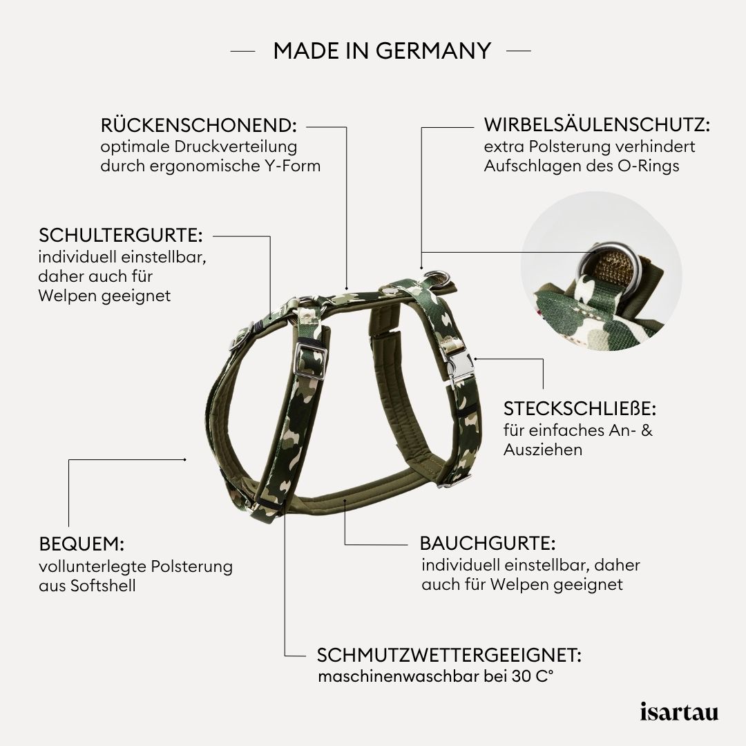 Für kleine und große Entdeckernasen: Unser Entdecker-Geschirr im Camouflage-Print in Grüntönen begleitet Euch über Stock und Stein – und sieht selbst in der City richtig stark aus. Innen weich gepolstert mit beigem Softshell für extra Komfort.