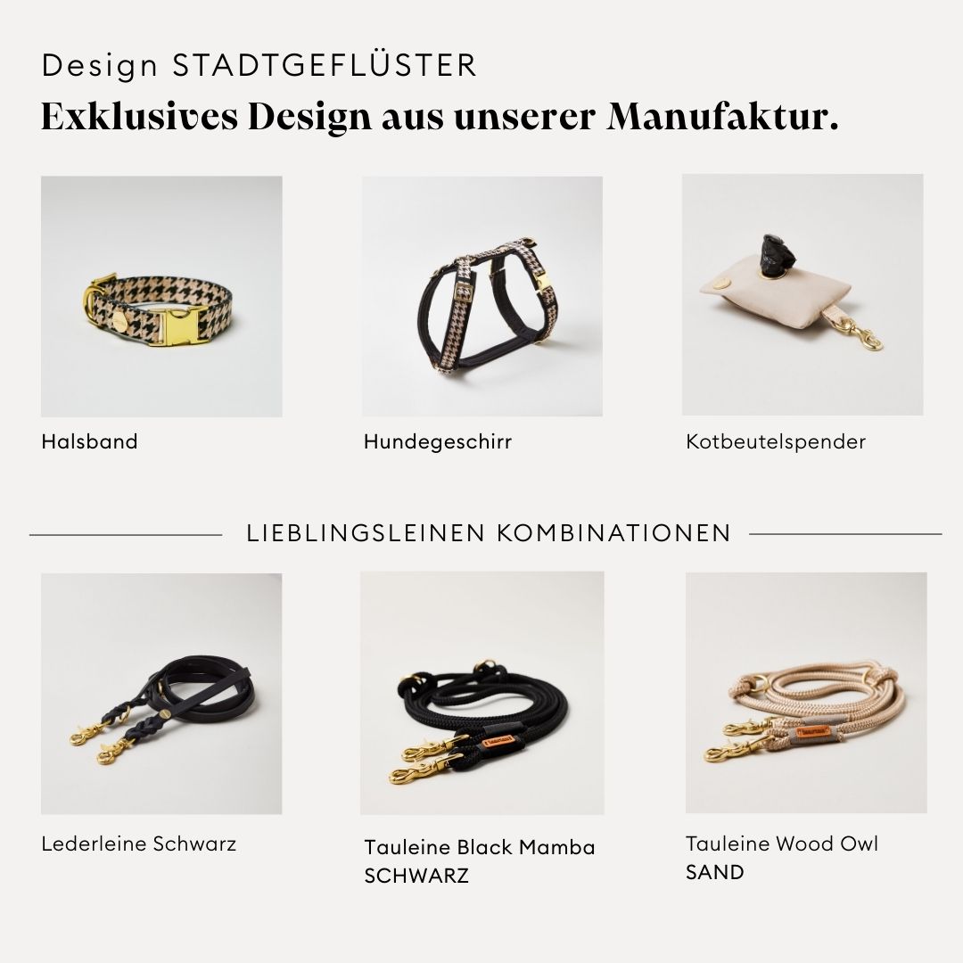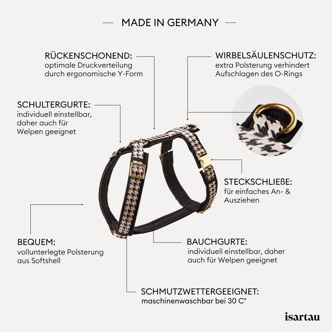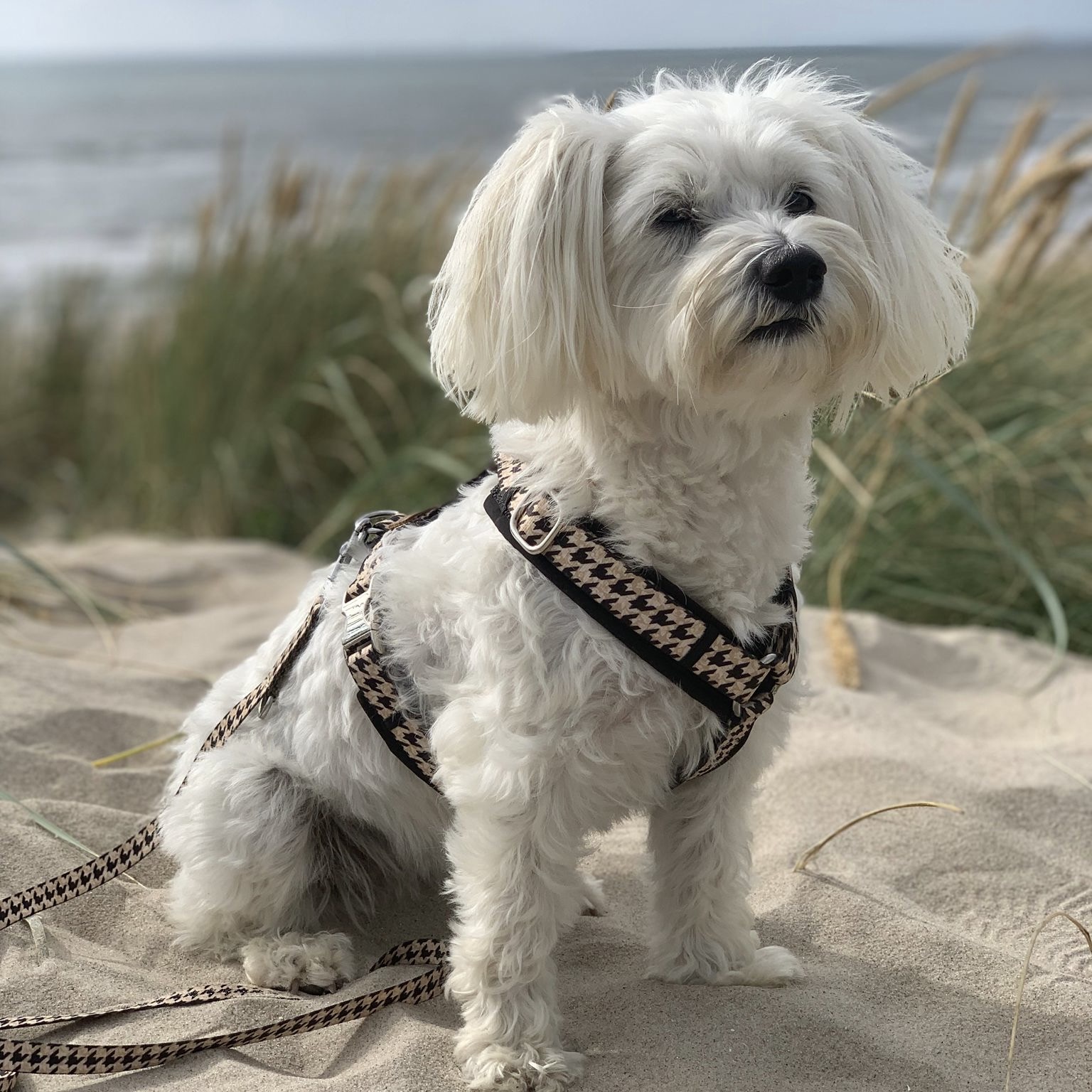Für einen stilvollen Auftritt: Unser gepolstertes Designer-Hundegeschirr „Stadtgeflüster“ im klassischen Hahnentritt. Beige und Schwarz für einen zeitlosen, urbanen Look.