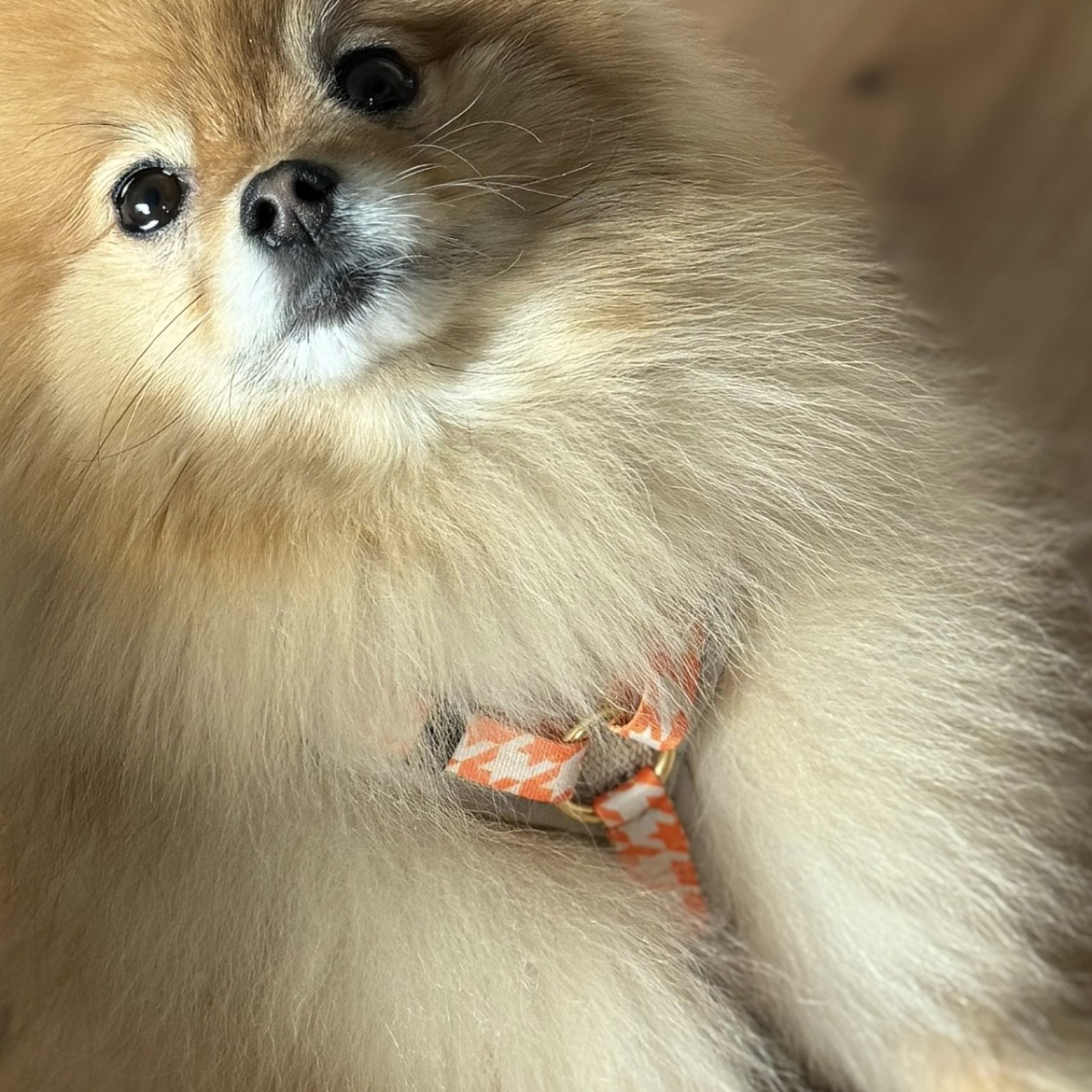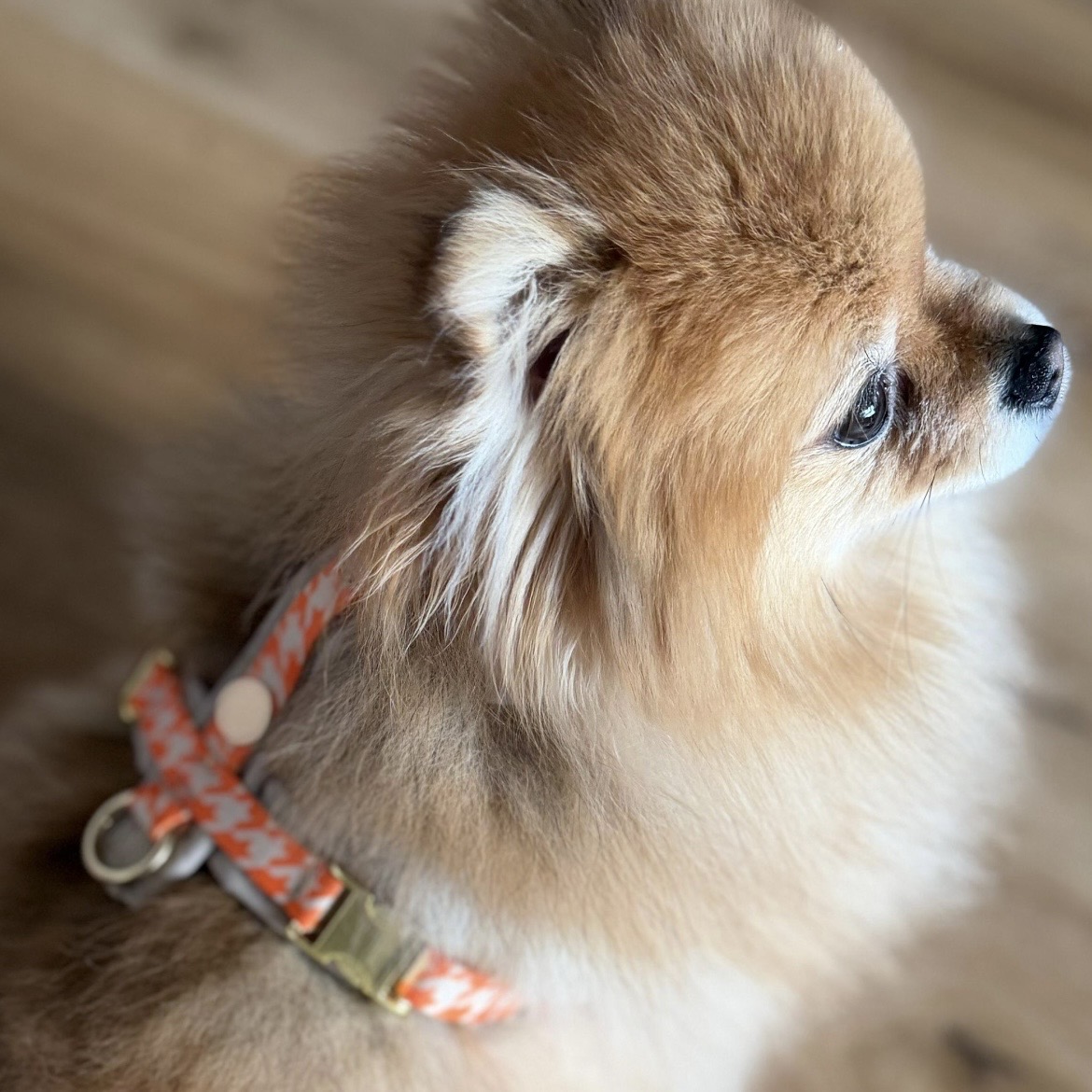 Das Hahnentritt-Muster changiert wundervoll in sanften Beige-Orange-Tönen und wirkt frisch, freundlich und einfach besonders. Tipp: Gleich mit der passenden Designerleine kombinieren!