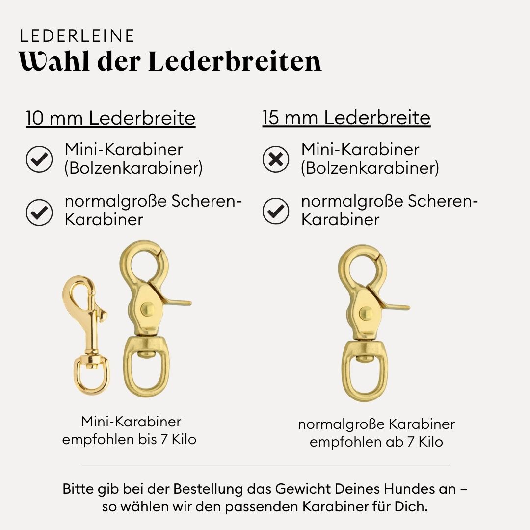 - Optimales Leinengewicht: Karabinergröße und Materialstärke werden individuell auf die Hundegröße abgestimmt.