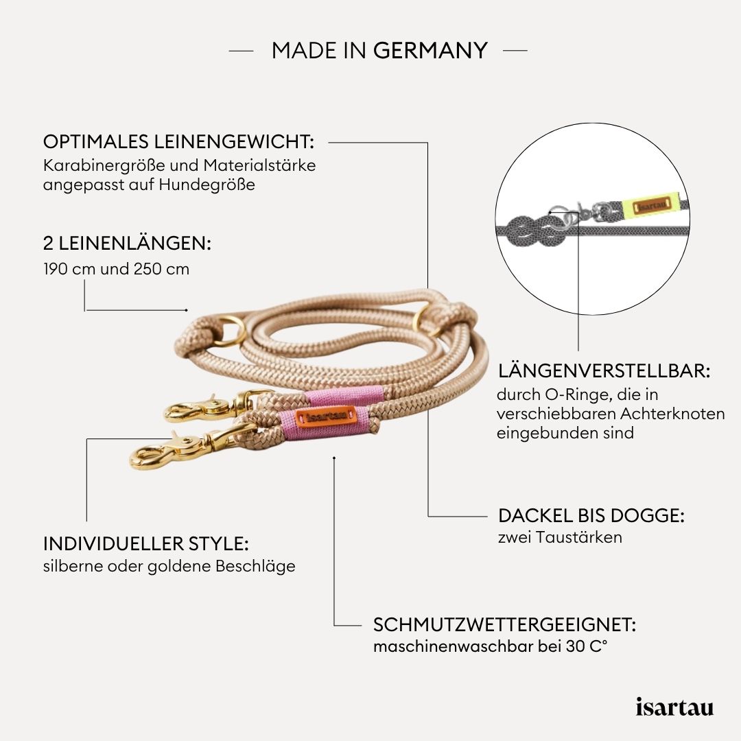 Unsere Führleine aus Tau ist der perfekte Begleiter für jede Gelegenheit – schlicht, funktional und stilvoll zugleich.