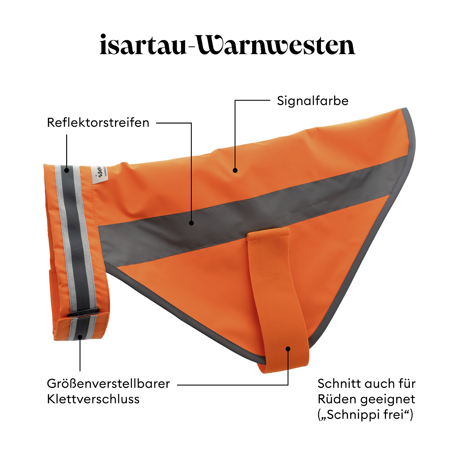 Unsere Warnwesten für Hunde sind durch langlebige Klettverschlüsse am Hals und an beiden Seiten des Körpers praktisch zu öffnen. Bei Verschmutzung kann die Hundeweste bei 30 °C in der Waschmaschine gereinigt werden. Die Warnweste geht vom Rücken schräg nach vorn. Unter dem Bauch verläuft das Gummiband, so dass auch Rüden sie gut tragen können und der Schnippi nicht im Weg ist.