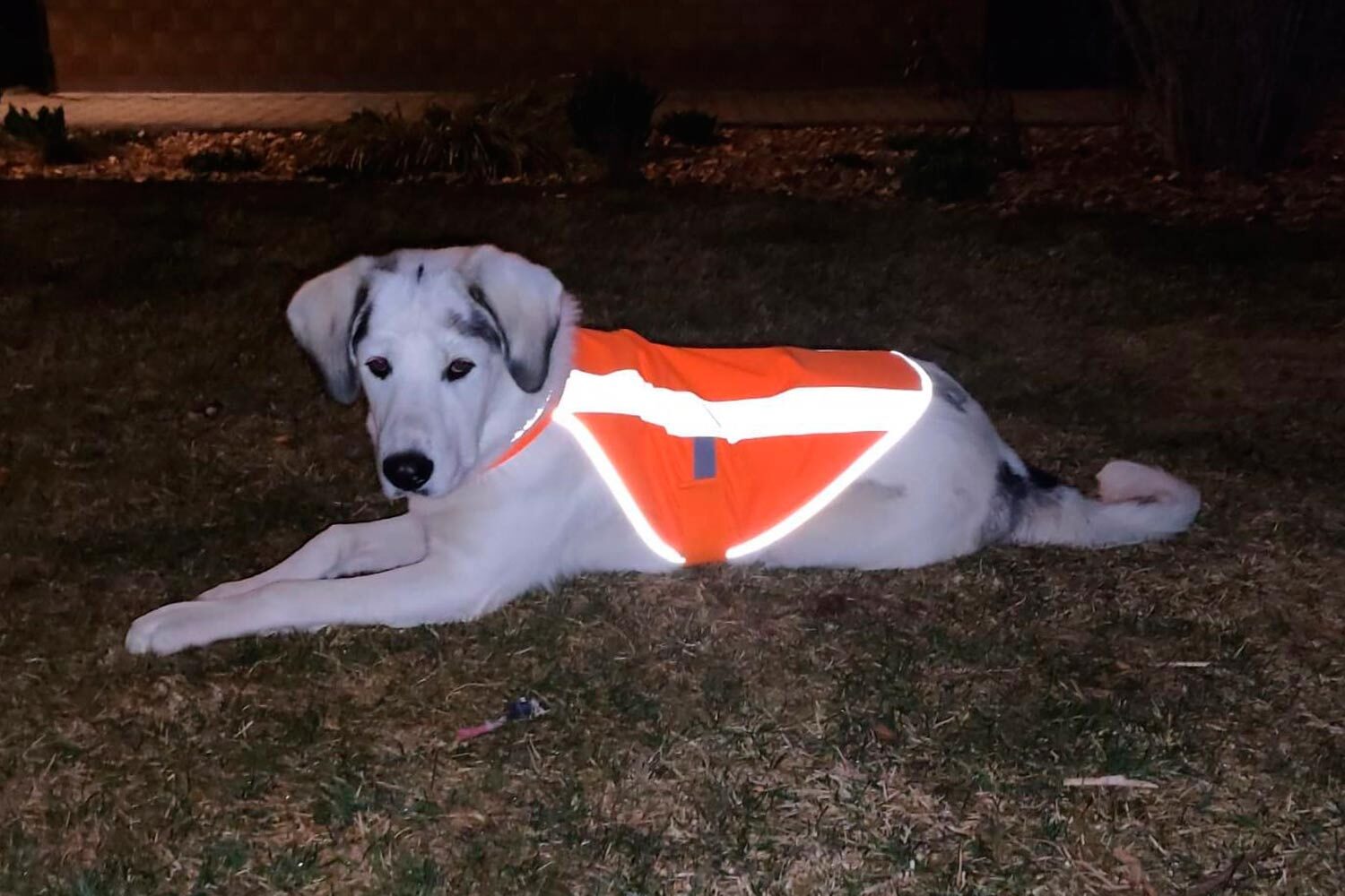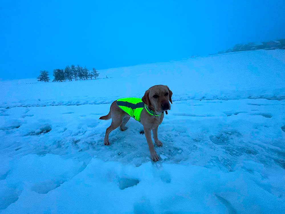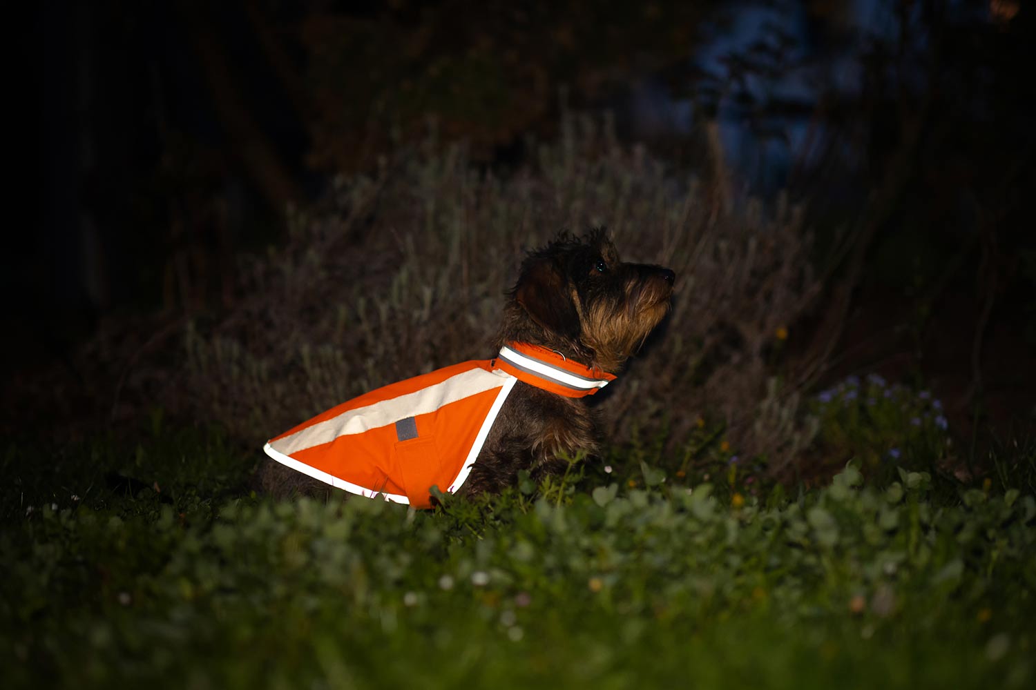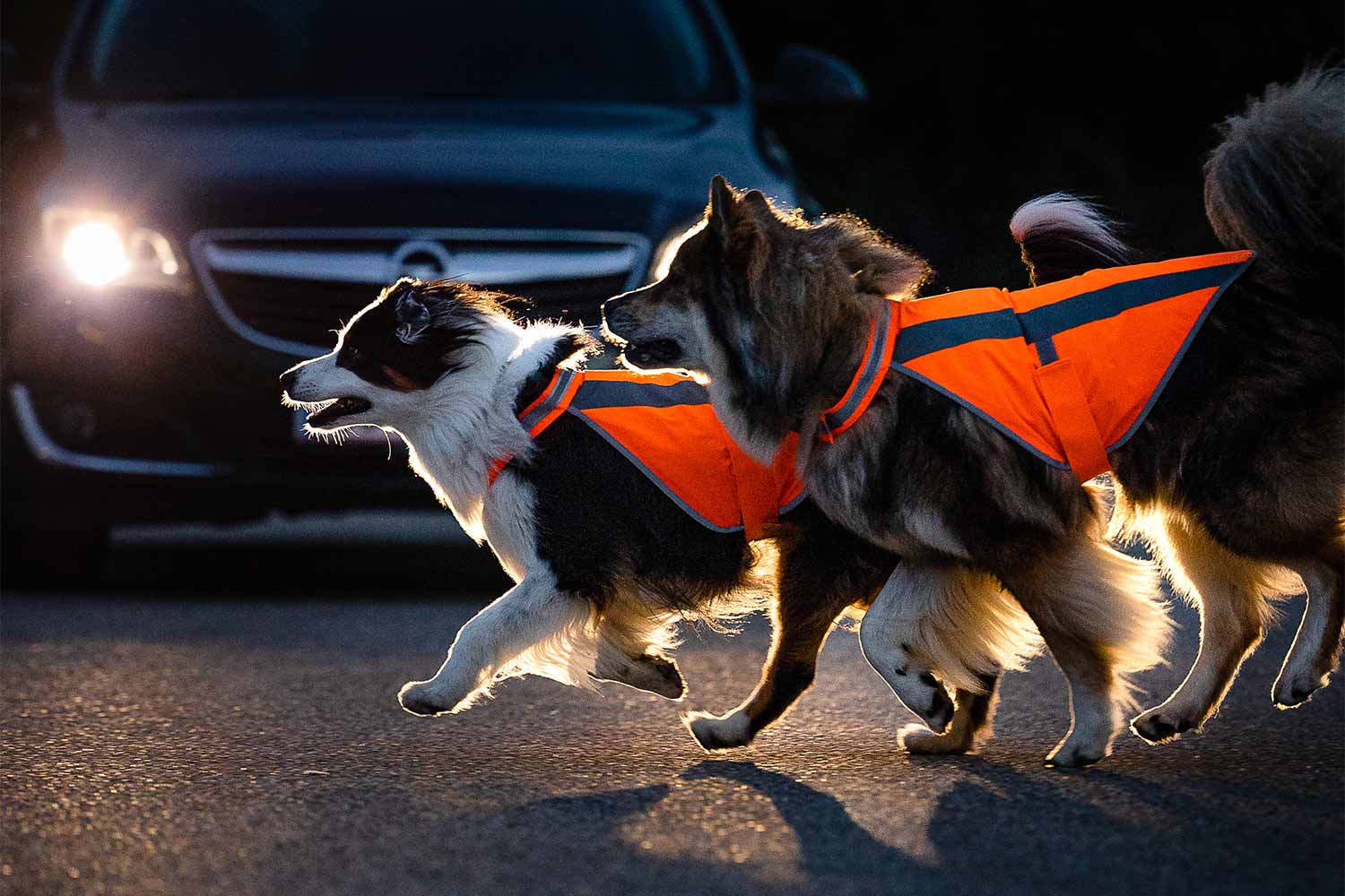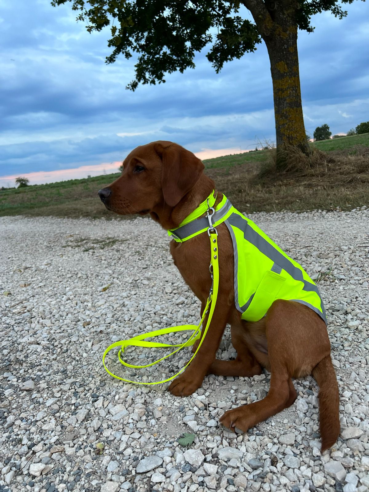 Zur Unterstützung haben wir auch auf den Warnwesten Reflektorbänder angebracht. Diese leuchten auf, sobald ein Lichtstrahl auf sie trifft. Das gleiche gilt für unsere Reflektorhalsbänder.